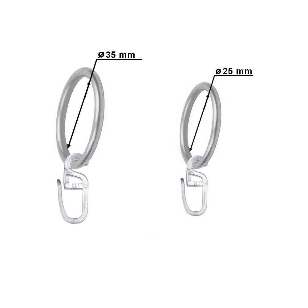 • Kroužky s žabkou či háčkem. Jsou vždy po každých 10cm. Např. jednořadá kovová garnýž 100cm obsahuje 10ks kroužků, dvouřadá 100cm pak 20ks kroužků. Případně bez kroužků při volbě na tunýlek.